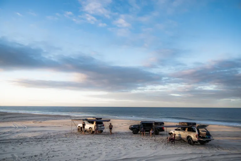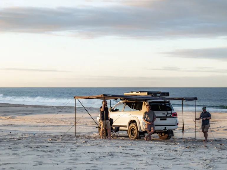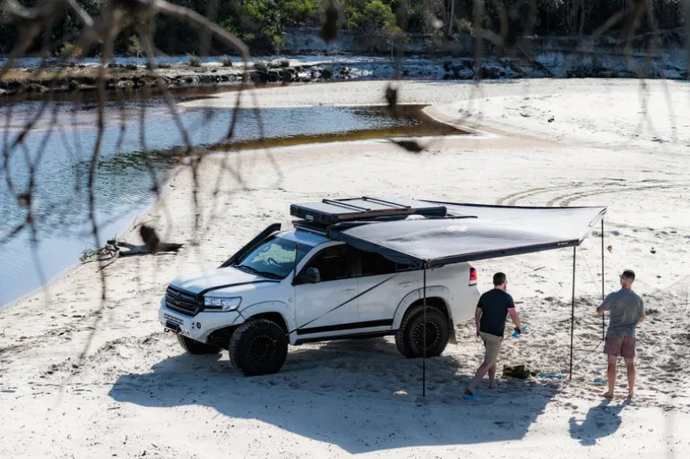 The unique 270 degree shape provides more than 20sqm of cover wrapping around the side and rear of your vehicle, and the included universal wall is easily attached to extend your cover or provide privacy. Lightweight U-channel alloy rafters house integrated upright poles for fast and easy set up and pack down. For even more cover, an included roof panel slides into the last rafter to tie to your roof rack to protect that back of your vehicle in bad weather. Premium mounting hardware is included, and suits most roof rack configurations.