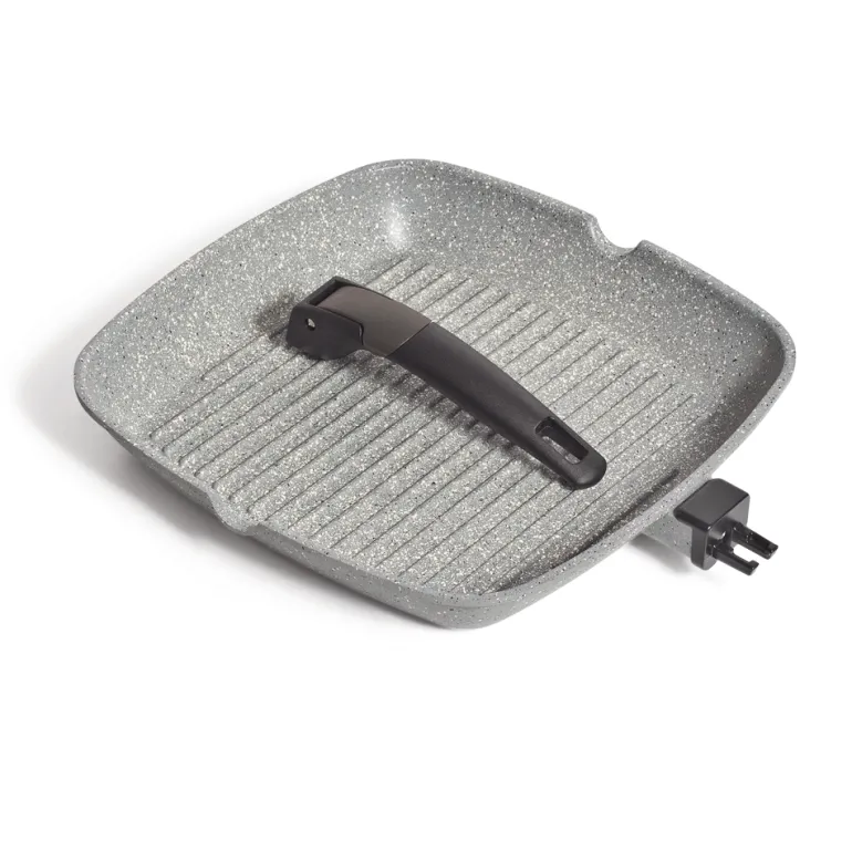 Lightweight diecast aluminium grill pan designed for fast cooking, featuring detachable handles and a triple-coated non-stick surface. Compatible with induction cooktops and oven-safe with the handle removed.