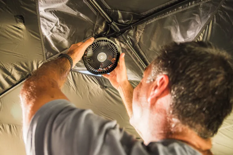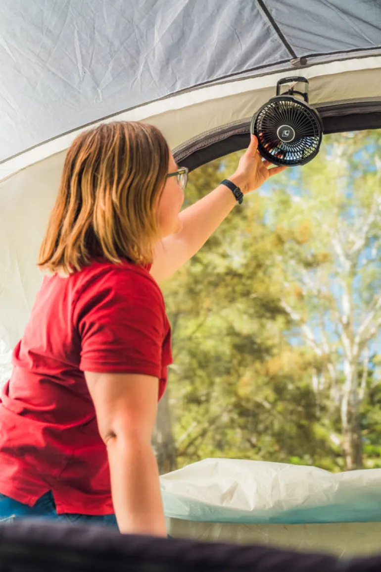 Designed for ultimate flexibility, the Aerobreeze Anywhere Fan is built to go wherever you do. With a 2-in-1 stand and hanging hook system, it can sit securely on a table or hang easily inside a tent, swag, or anywhere you need cooling comfort. The fan head pivots 180 degrees, giving you complete control over airflow direction. Choose from four speed settings to match your needs, and set one of three pre-programmed timers – or let it run continuously. Clear indicator lights show your selected speed, timer setting, and battery level at a glance. Powered by a 3,000mAh rechargeable lithium battery, it’s perfect for off-grid adventures. Built tough with ABS plastic and a protective rubber guard, it’s made to handle life on the road.