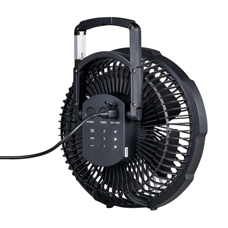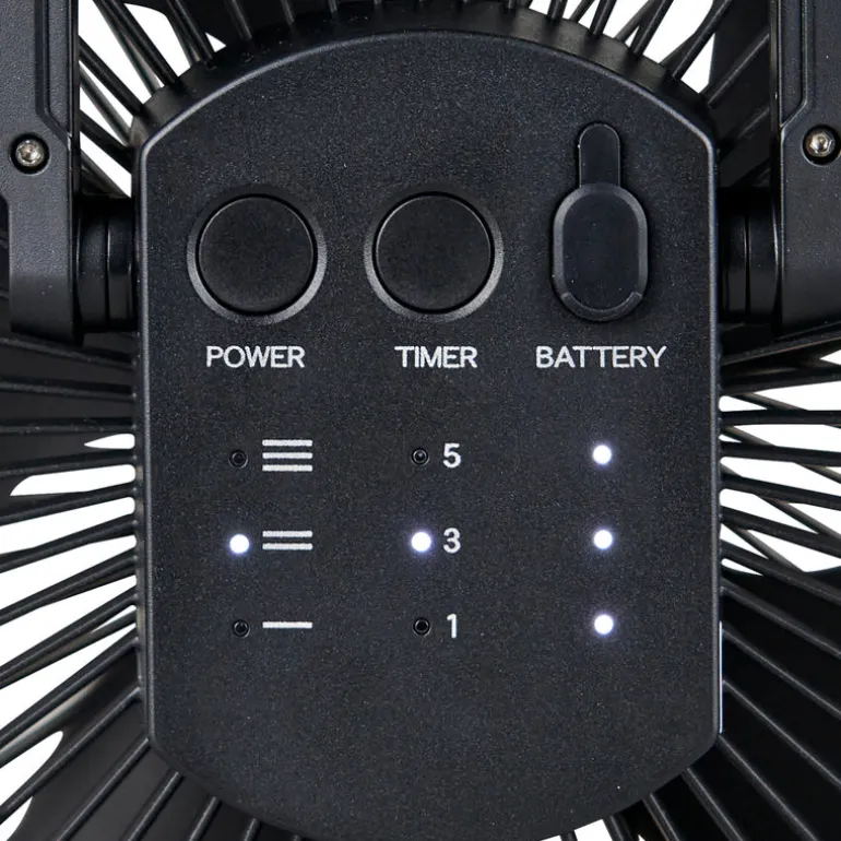 - Indicator lights show fan speed, timer, and battery level.