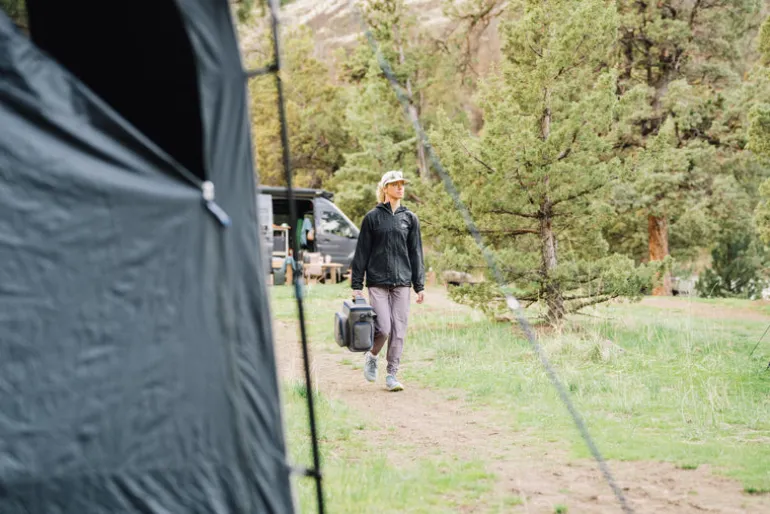 - Oversize zip pocket for shower head, bracket and hose. Recessed pocket for your gas bottle and mesh sleeve for hoses and pump.