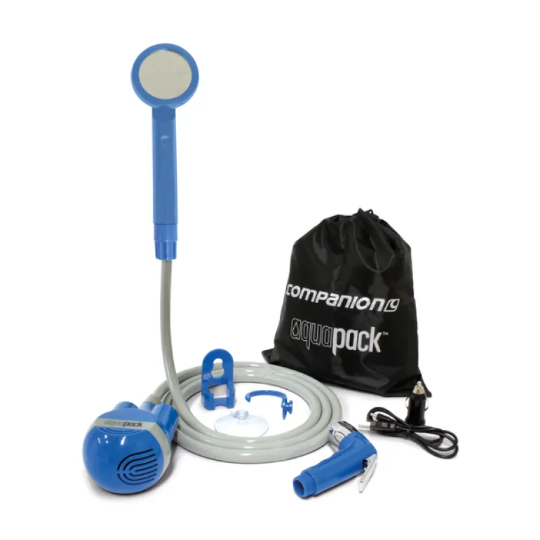 Upgrade your camping setup with the Companion Aquapack Rechargeable Camp Shower. Cordless and portable, this shower provides luxury in the wild. Powered by a Lithium-Ion battery, it offers 70 minutes of runtime and easy recharge via a car adapter or USB cable. Perfect for after a long day outdoors, it includes two shower heads, a carry bag, and user-friendly one-touch operation for ease of use.