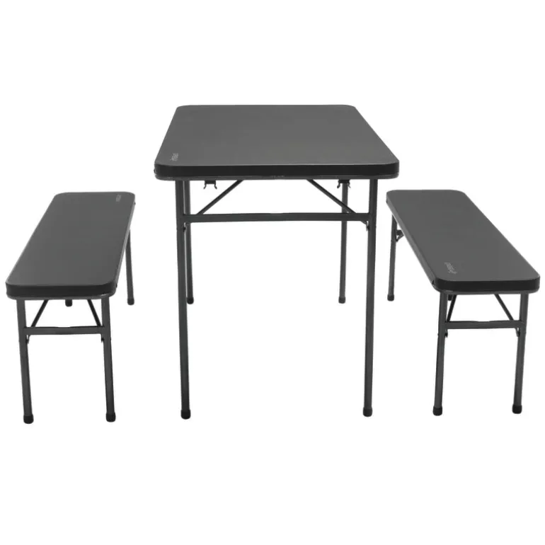 A 3-piece table and bench set perfect for picnics or camping, featuring a durable corrosion-resistant frame and clips to hold benches in place during transport.
