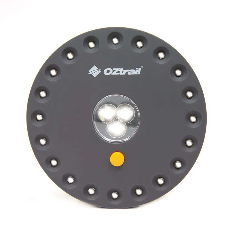 A compact LED light for tents or gazebos, featuring 23 ultra-white LEDs and over 24 hours of continuous battery life. It attaches easily with a hook or magnet and is water-resistant.