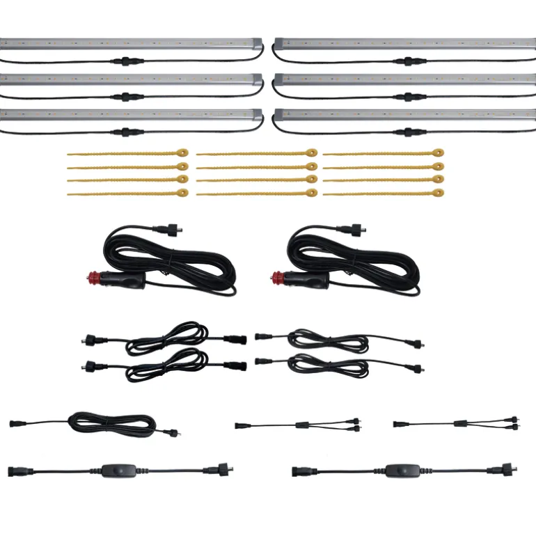 A complete campsite lighting solution with 6 x 50cm light bars. Each bar features white and amber LEDs with dimmer control for adjustable brightness. Includes reusable flexi ties, making setup easy and versatile in any outdoor environment.