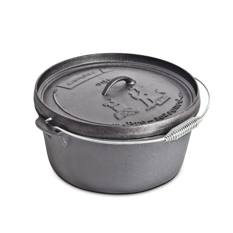 Pre-seasoned Dutch oven with a 9-quart capacity, made of durable cast iron. Ideal for outdoor cooking, with a flanged lid for holding coals.