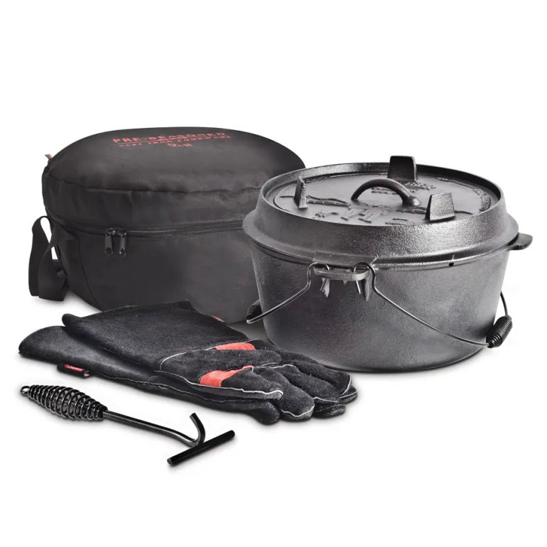 A 9QT pre-seasoned camp oven designed for durability. Comes with a reversible lid/skillet, storage bag, lid lifter, and leather gloves. Pre-seasoned with vegetable oil, it provides reliable performance for outdoor cooking.