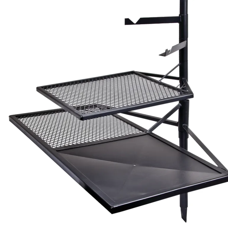 A large camp grill made of solid heavy-gauge steel with ample cooking areas. Comes with 2 hanging hooks for camp ovens and a storage bag for easy transport.