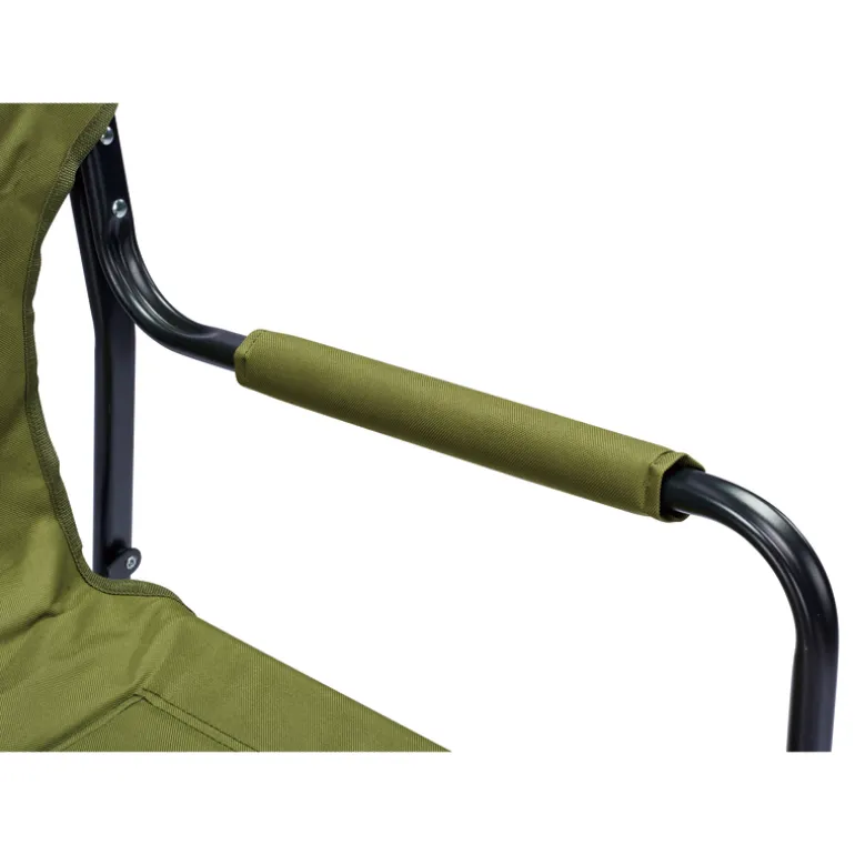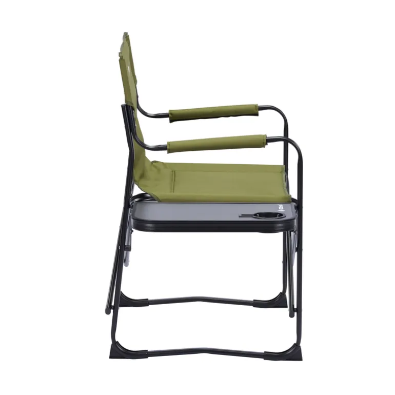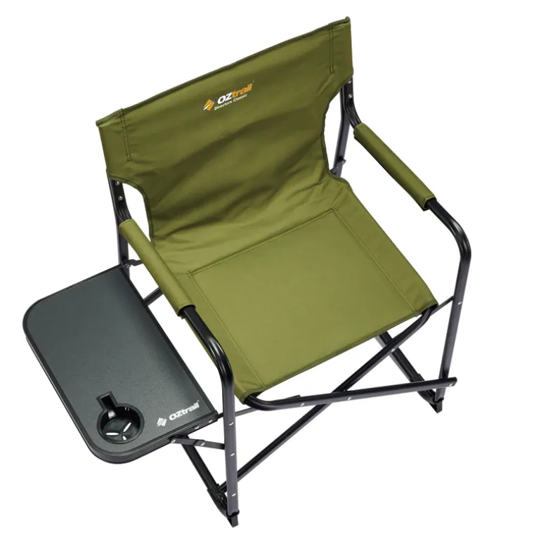 The OZtrail Classic Directors Chair offers comfort and convenience with its foldaway side table, padded armrests, and durable steel frame. It folds flat for easy transport, making it ideal for camping or outdoor events.