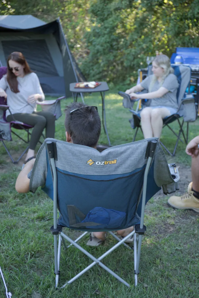 This comfortable and stylish chair features wrap-around arms and a wine glass holder. It is built with a high-tensile steel frame and 600D polyester fabric, offering padded construction for comfort. It folds into a compact carry bag for easy transport.