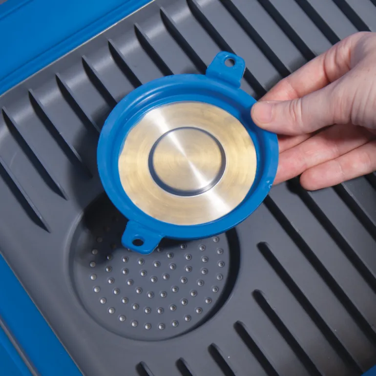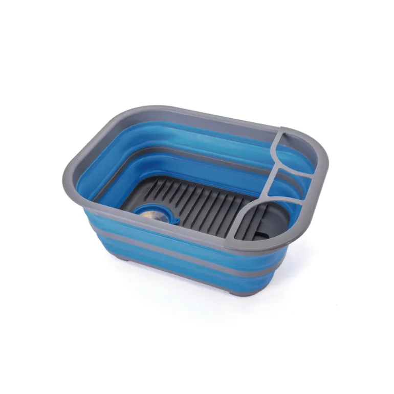 Collapsible dish tray and tub with a grooved base to position plates and a removable drain plug for convenience. Great for washing or stacking dishes while camping or at home.